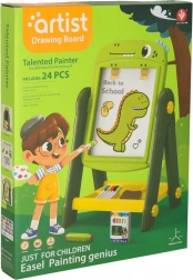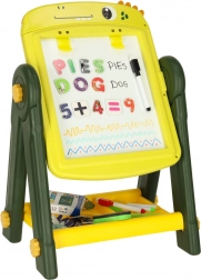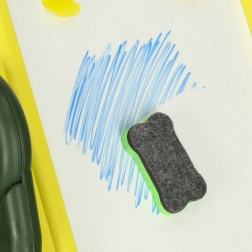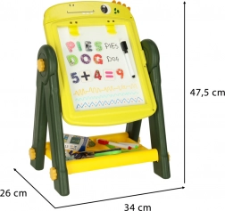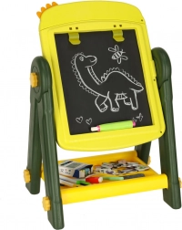 Tato dvoustranná edukační tabule je ideálním nástrojem pro rozvoj kreativity a učení u dětí. Na jedné straně se nachází magnetický bílý povrch, který umožňuje suchostíratelné malování a psaní fixami, zatímco druhá strana slouží jako klasická černá tabule pro kreslení křídou. Ozdobená veselým dinosauřím motivem, tato tabule okouzlí každé dítě svou barevností a možnostmi využití.