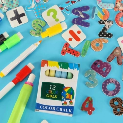 Součástí jsou různé učební pomůcky jako jsou magnetická písmena, čísla, křídy a fixy.