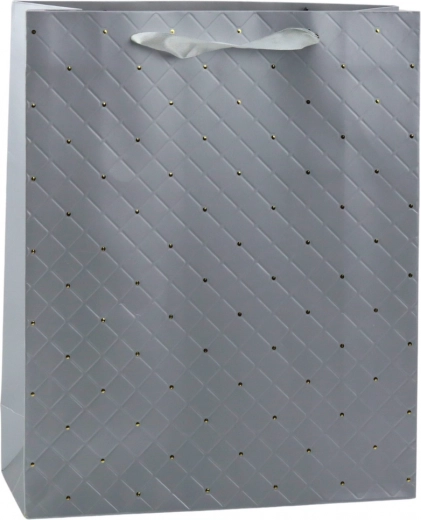 Tato stylová šedá dárková taška je perfektní volbou pro ty, kteří upřednostňují moderní eleganci a klasický vzhled. Její jemná barva v kombinaci s geometrickým vzorem a zlatými tečkami dodává sofistikovaný vzhled, ideální pro svatební a slavnostní příležitosti.