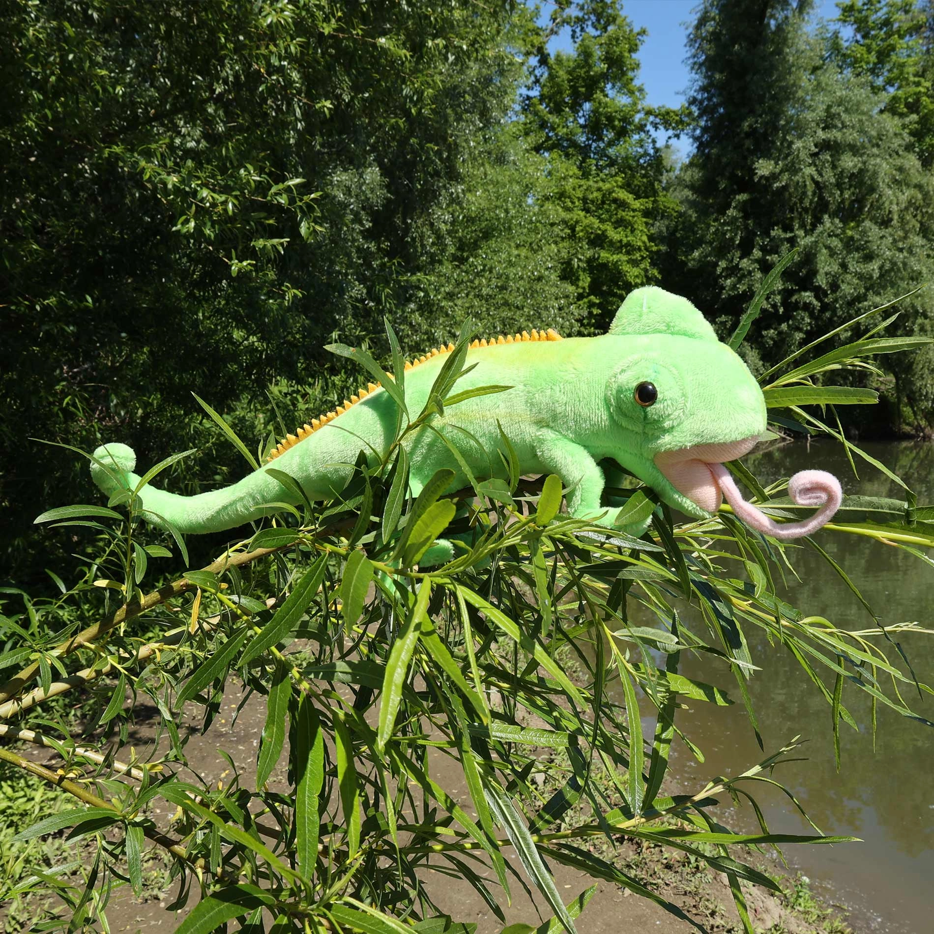 Vyšívané prvky, oranžové hřbetní ostny a roztomilý růžový jazýček dělají z chameleona věrného plyšového kamaráda.