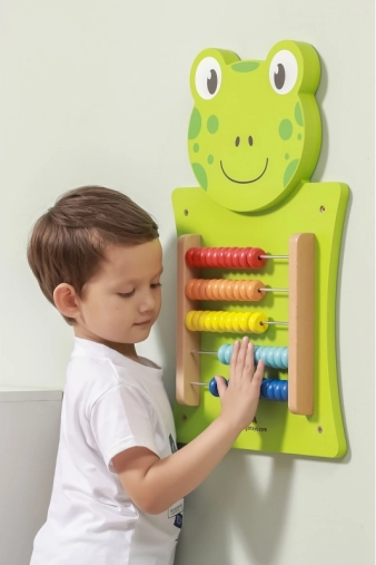 Toto žabí počítadlo kombinuje hravou estetiku s praktickým učením. Pět vodorovných tyček s barevnými korálky podněcuje děti k posouvání a počítání, čímž si trénují jemnou motoriku, oční‑rukovní koordinaci a logické myšlení. Nástěnné provedení šetří místo a zároveň je vždy po ruce.