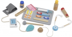 - Profesionální lékařské nástroje jako tlakový měřič, stetoskop, teploměr, reflexní kladívko, rentgenový přístroj, injekční stříkačky, tablety a lékovky,