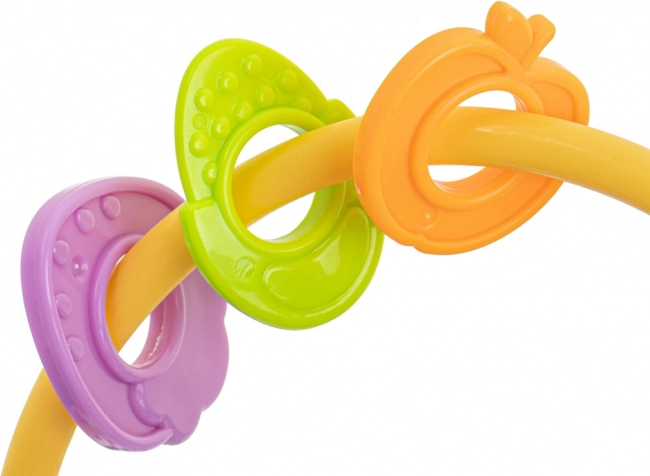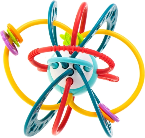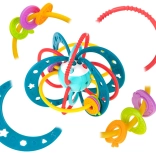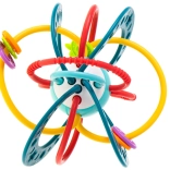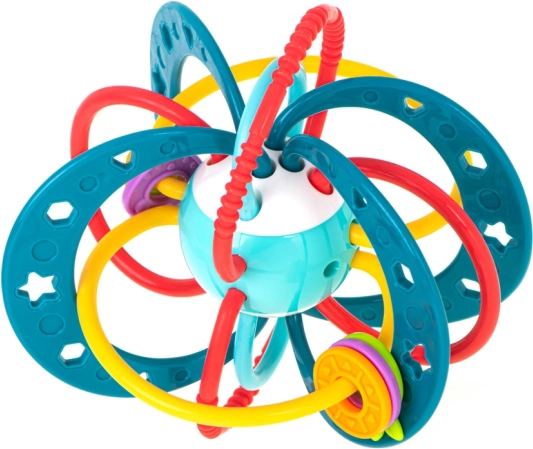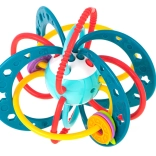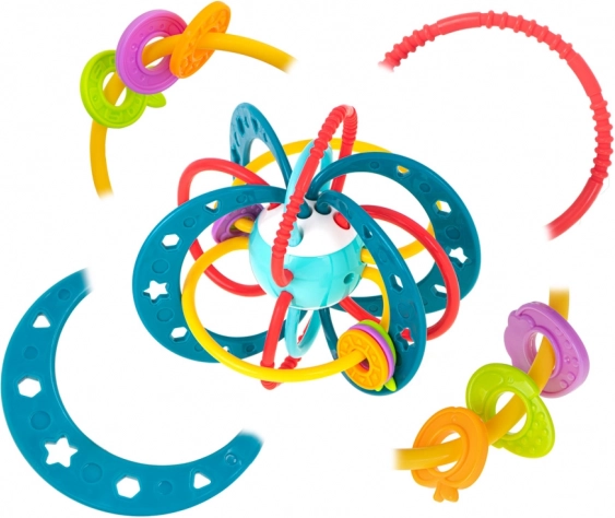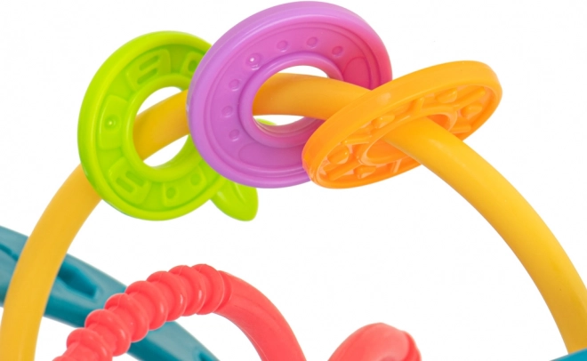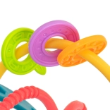 Vyrobeno z kvalitních, netoxických materiálů, které jsou šetrné k dětské pokožce i dásním. Flexibilní propletené kroužky zvou k uchopení a mačkání, čímž podporují rozvoj jemné motoriky a koordinace oko–ruka.