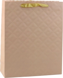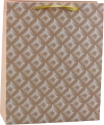 Dárková taška je vyrobena z vysoce kvalitního zpevněného papíru, její povrch zdobí embosovaný geometrický vzor, který krásně odráží světlo. Dva varianty přední a zadní strany zajišťují, že taška vypadá stylově z každého úhlu. Saténová ucha ve světlém odstínu dodávají celé kompozici jemný charakter a zaručují pohodlné přenášení.