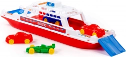 Objevte zábavu na vodě i na souši s plastovým trajektem BALTIC a čtyřmi mini autíčky. Hračka vyniká živými barvami, odolným kvalitním plastem a funkčními nájezdy pro snadné nakládání autíček – ideální do vany, na zahradu i k jezírku.