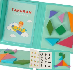 Zábavná a chytrá hra pro děti od 3 let: magnetická knížka s barevným dřevěným tangramem. Díky magnetům mohou děti skládat tvary kdekoliv, bez ztrácení dílků. Součástí je knížka s 96 předlohami v barevné i černobílé verzi. Podporuje logické myšlení, kreativitu a jemnou motoriku – ideální Montessori pomůcka na doma, na cesty i do školy.