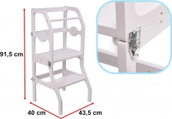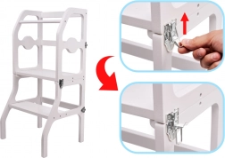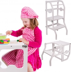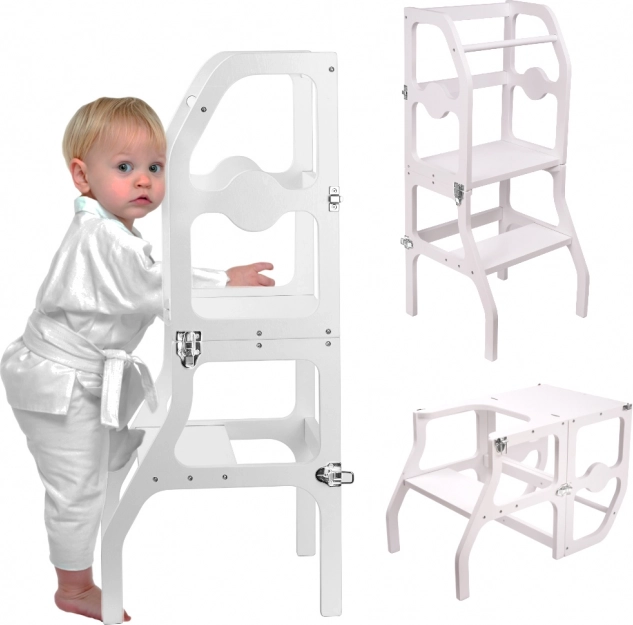 Náš kuchyňský pomocník v sobě spojuje 2 funkce, a je proto velmi praktický. Snadno a rychle ji přeměníte na stůl a židli, kde může vaše dítě společně jíst jídlo nebo se věnovat kreslení a hraní. Stačí odepnout kovové úchytky a spustit horní část. Díky minimalistickému stylu se hodí do každého interiéru.