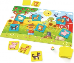 - pestrobarevný herní plán, pevné kartičky se zvířátky, kostka (dle popisu)