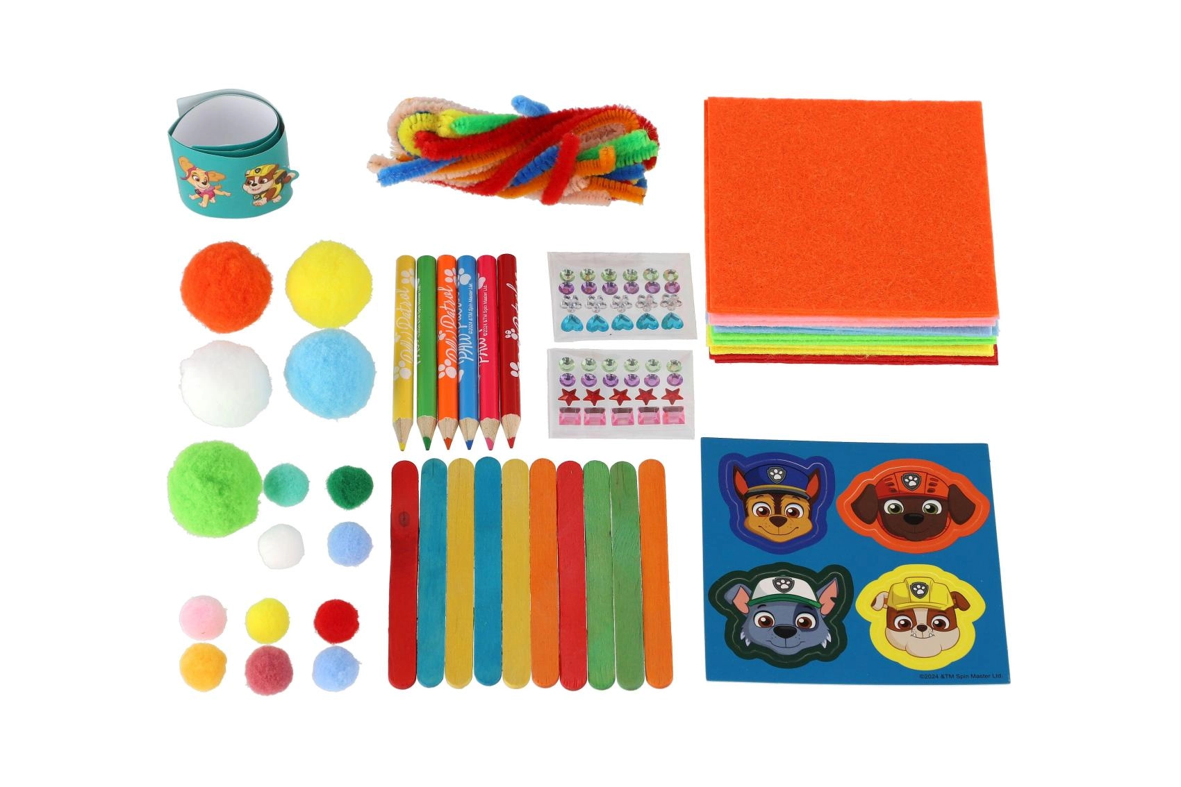 Uvnitř najdete pestrý mix pomůcek pro kolážování, lepení a kreslení: měkké bambulky, chlupaté drátky (chenille), pěnové či filcové tvary, dřívka, pastelky a samolepky s oblíbenými psími hrdiny. Součástí jsou také karty a aktivity typu „navrhni si vlastní štít“, které rozvíjejí kreativitu a dovednosti.