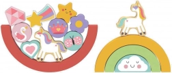 Všechny bloky jsou vyrobeny ze dřeva s certifikací FSC, což zaručuje šetrný způsob získávání materiálů. Hračka nejenže poskytuje zábavu, ale také rozvíjí jemnou motoriku, což pomáhá malým rukám při učení sestavovat různé tvary.