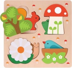 Objevte kouzlo přírody s Petit Collage vkládacím puzzle, které vaše děti nadchne. Toto vícevrstvé, osmidílné puzzle představuje domovy oblíbených zvířátek, jako jsou žabky, ptáčci, veverky a šneci. Rozložte každý dílek a najděte správné místo pro každý zvířecí domov.