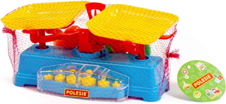 Stabilní konstrukce, velké misky a syté barvy usnadňují manipulaci i těm nejmenším. Rozměry celé sady jsou přibližně 28 × 13 × 13 cm, takže se snadno vejde na dětský stůl či poličku.