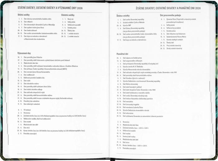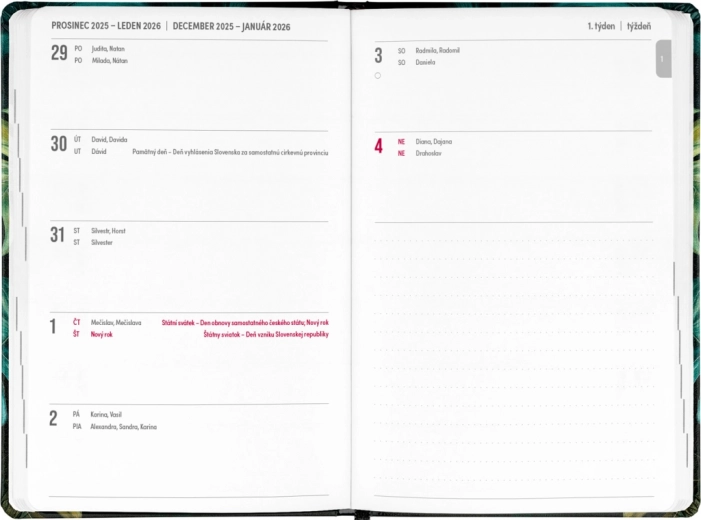Diář Petito Monstera je ideálním pomocníkem pro plánování na období od července 2025 do prosince 2026. Díky přehledu na rok 2025 a 2026 a kalendáriu se jmény a svátky nejen v češtině, ale i ve slovenštině, budete mít vše důležité vždy při ruce. Praktické uspořádání vám umožní snadnou orientaci a místo na poznámky poskytuje prostor k zaznamenávání důležitých úkolů a myšlenek. Diář má elegantní design s motivem Monstera, který potěší každého milovníka stylových kancelářských potřeb.
