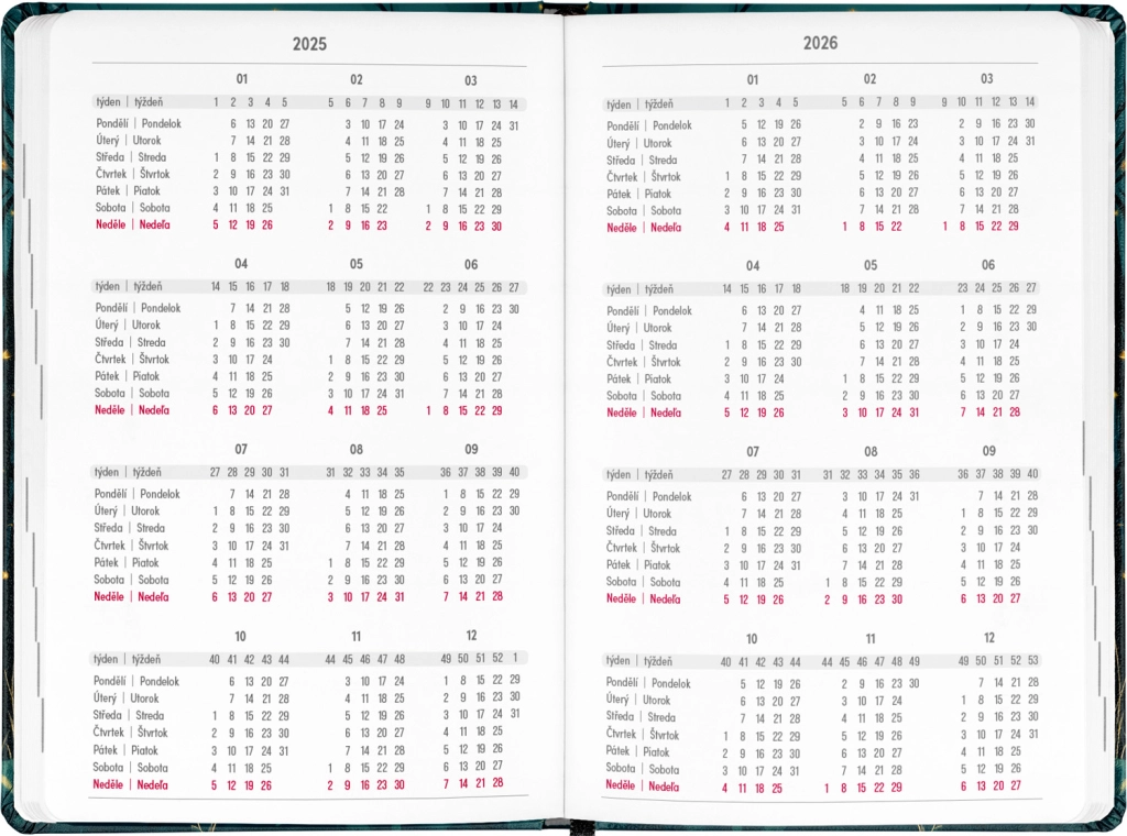 Kalendárium začíná v červenci 2025 a končí v prosinci 2026, což nabízí 18 měsíců plánování.
