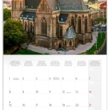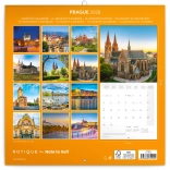 Kalendář zahrnuje ikonické pražské památky, jako jsou katedrály, mosty a historické ulice.