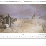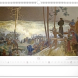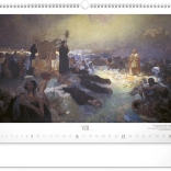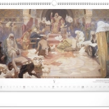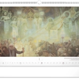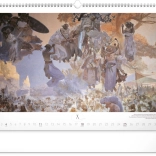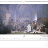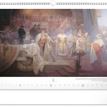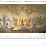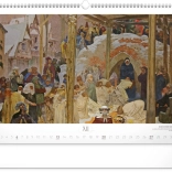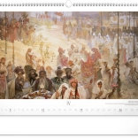 Nástěnný kalendář s reprodukcemi mistrovských děl Alfonse Muchy ze série Slovanská epopej, ideální pro milovníky umění a historie.