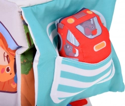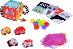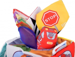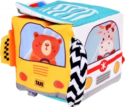 • Měkká autíčka: Textilní auta zobrazující vozidla jako Taxi, Hasiči, Policie, Ambulance vydávají jemný zvuk při stlačení, čímž stimulují sluchové smysly.