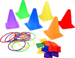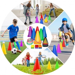 Tento set obsahuje kužele a obruče v živých barvách, které upoutají pozornost a zajistí zábavu při hraní. Jsou výborné pro označování hřiště nebo stanovišť.