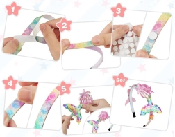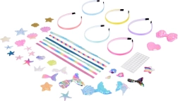 Kreativní sada Mořská panna splní sen každé malé dívky. Obsahuje vše, co je potřeba pro výrobu vlastní čelenky, včetně 6 čelenek v pastelových barvách, ozdob jako jsou lesklé stužky, ocásky, mušličky, hvězdy, srdíčka, mašličky, koruna a syrenky. Vše je vybaveno samolepkami, které nevyžadují použití lepidla nebo nůžek. Bezpečné a jednoduché pro malé děti.