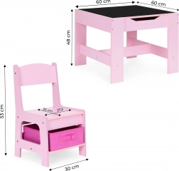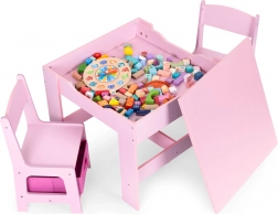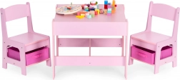 Hledáte praktický, bezpečný a esteticky příjemný dětský nábytek? ECOTOYS má pro vás řešení. Set zahrnuje stůl s oboustrannou deskou a dvě židle vybavené látkovou zásuvkou pod sedadlem. Tím se vaše děti snadno naučí udržovat pořádek.