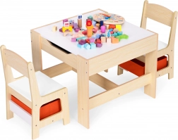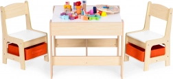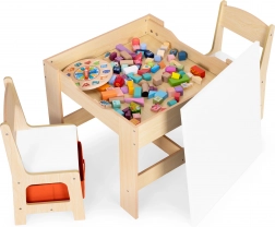 Dětská nábytková sada je perfektní místo pro hraní a relaxaci. Díky robustnímu provedení z MDF je úložná funkce pod stolní deskou praktická pro uskladnění hraček a potřeb. Deska stolu je dvojstranná a odnímatelná, což nabízí tvůrčí prostor pro kreslení a psaní s integrovanou tabulí na křídy.