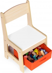 Židle v sadě mají pohodlné rozměry, které jsou sladěny s výškou stolu, čímž zajišťují správné držení těla a svobodu pohybu během hraní i učení. Každá židle je vybavena praktickou textilní zásuvkou, která je pohodlná a snadno použitelná.