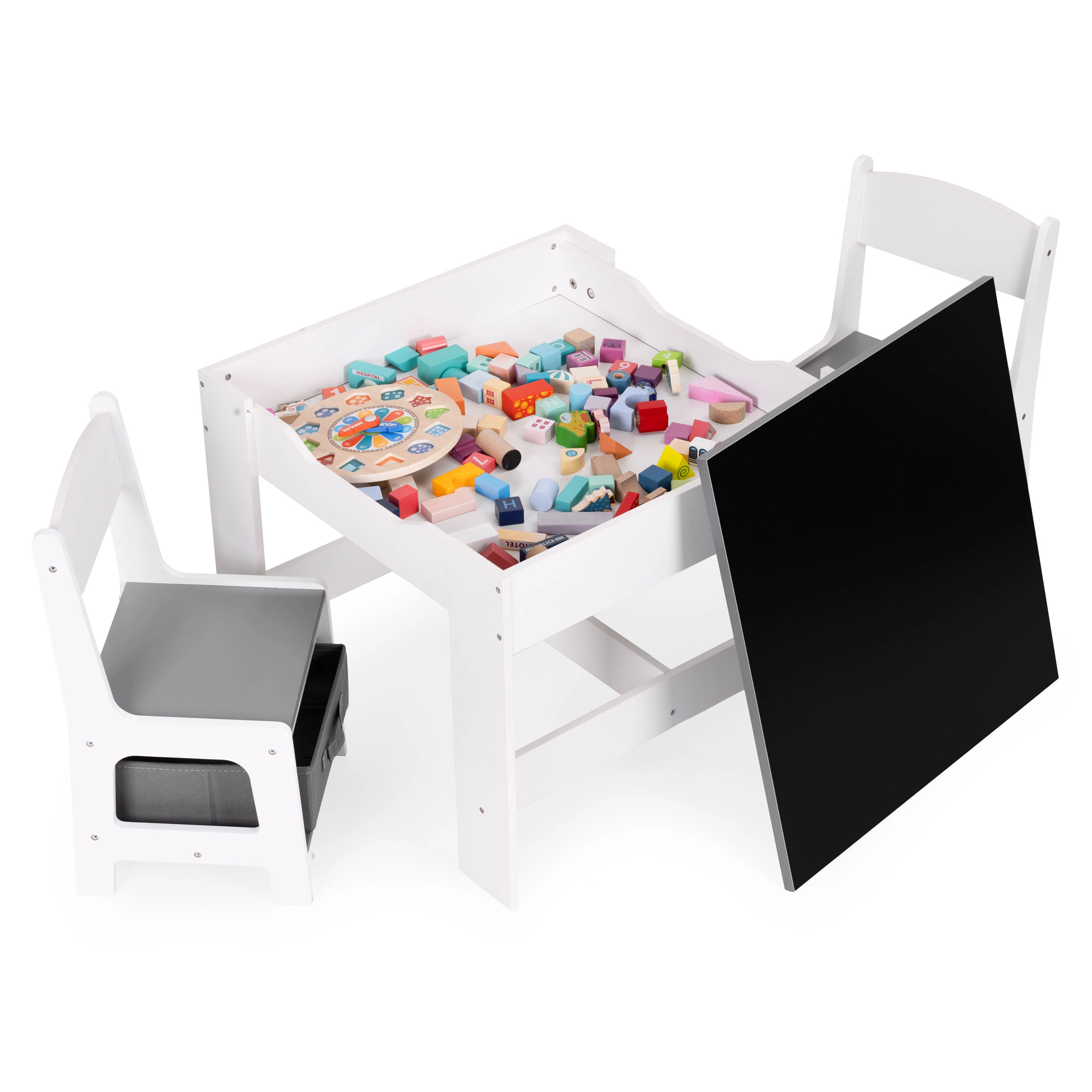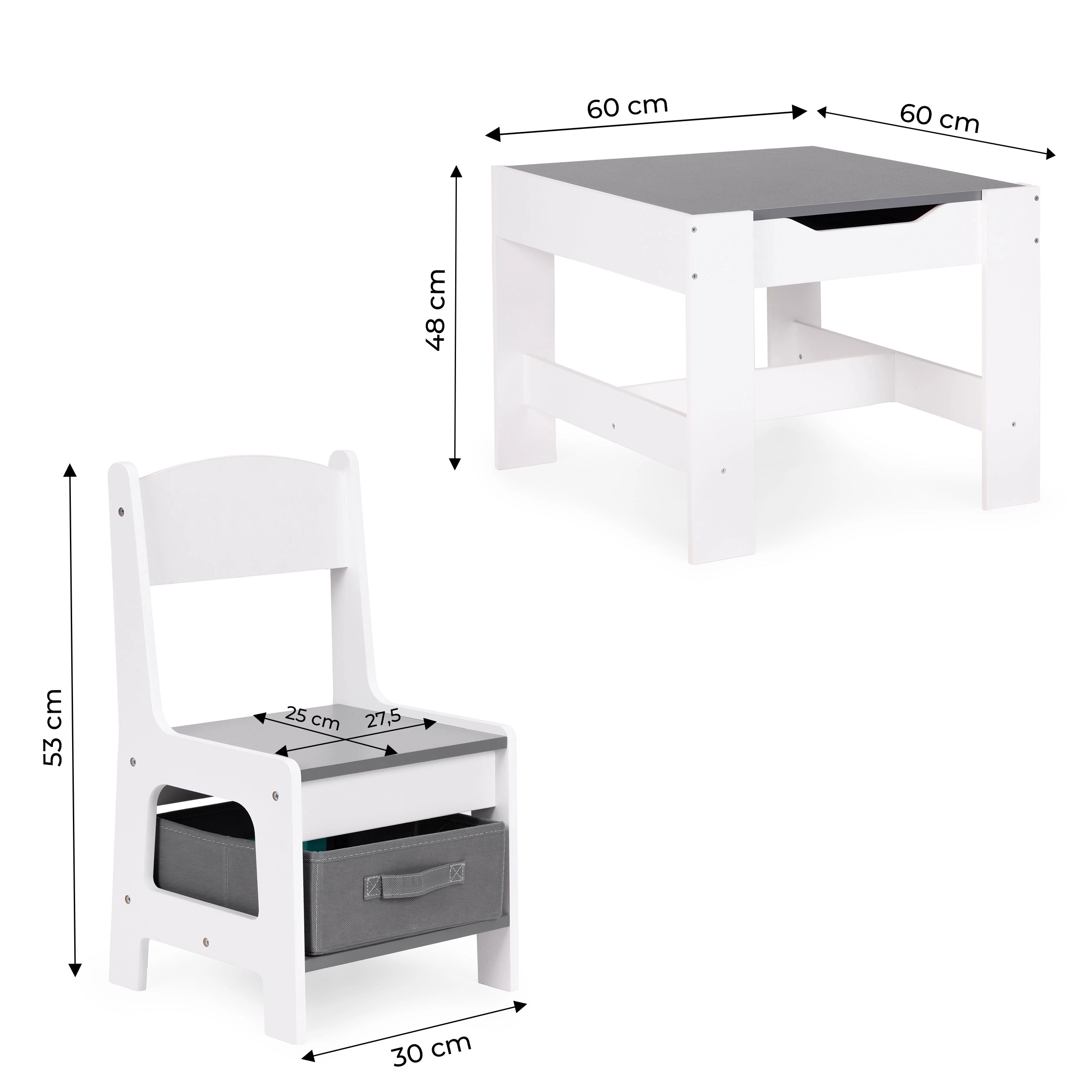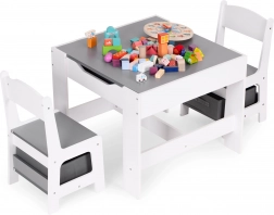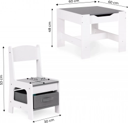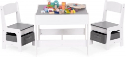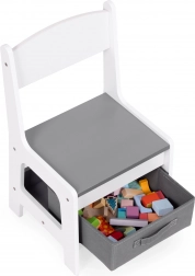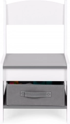Úložný prostor pod stolní deskou nabízí místo na hračky a doplňky. Židle jsou vybaveny praktickými látkovými zásuvkami, které udržují vše důležité vždy po ruce. Díky chytrému designu si mohou děti snadno zorganizovat své okolí a naučit se pořádku.