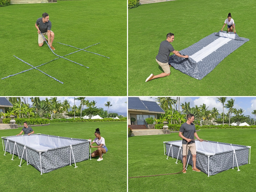 Součástí setu 7 v 1 je vše, co potřebujete pro rychlý start: filtrační pumpa o průtoku 1 249 l/h, filtr typu I, hadice, sítka a spony i návod. Montáž bez nářadí zvládnete přibližně za 40 minut. Moderní šedý vzor a bílý rám dodají vaší zahradě elegantní vzhled a dětem i dospělým spoustu letní zábavy.