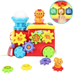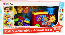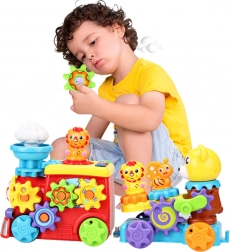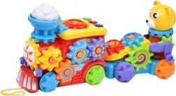Veselý vláček s přívěsem a medvídkem je navržen tak, aby nejen bavil, ale také rozvíjel jemnou motoriku, pozornost a představivost dítěte již od prvních okamžiků hry. Hračka je vybavena otáčejícími se ozubenými koly, které zapojují ručičky dítěte a pomáhají rozvíjet přesné pohyby. Světelné a zvukové efekty stimulují smysly a uvádějí dítě do světa audiovizuálních podnětů. Uprostřed vláčku se nachází pohybující se mráček a před přívěsem včelka, která se aktivuje otočením speciální kliky u medvídka.