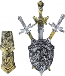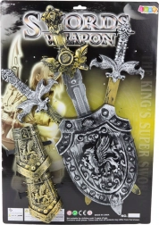 Tato sada obsahuje tři různé rytířské meče, včetně jednoho většího, hlavního zbraně bojovníka, zdobený štít s heraldickým motivem a dva chrániče na ruce napodobující součásti brnění. Všechny díly jsou vyrobeny z lehkého, ale odolného plastu, který je bezpečný a odolný vůči intenzivnímu hraní.
