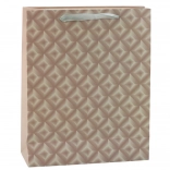 Tato dárková taška je vyrobena z kvalitního, zpevněného papíru. Povrch je zdoben geometrickým reliéfem, který krásně odráží světlo. Obsahuje saténové úchyty v jemném odstínu, které zajišťují pohodlné přenášení a dodávají tašce jemný charakter.