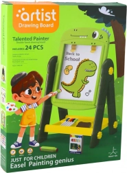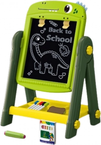 Tabule obsahuje klipy pro uchycení papíru, což dětem umožňuje vytvářet umělecká díla. Součástí balení je bohatý set příslušenství, včetně markerů, křídy, houby a barevných magnetů s písmeny, číslicemi a matematickými symboly.