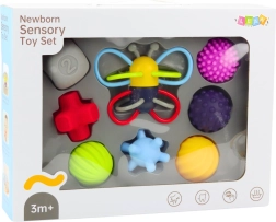 V sadě se nacházejí měkké míčky s výstupky, flexibilní kousátka zajímavých tvarů, prvky pro mačkání a také chrastítko s lehkou a praktickou konstrukcí, které upoutá dítě zvukem a tvarem. Všechny komponenty jsou vyrobeny z vysoce kvalitních, netoxických materiálů bezpečných pro děti – vhodných ke žvýkání, mačkání a prozkoumávání ústy nebo ručičkami. Povrchy jsou přátelské ke kůži a velikost prvků je ideálně přizpůsobena dětským ručičkám.