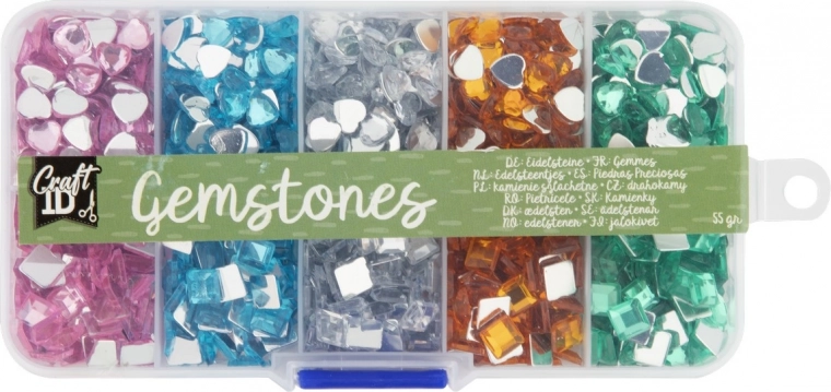 Sada barevných drahokamů nabízí krásné kameny v 5 barvách a 2 tvarech, vše baleno v praktickém plastovém pořadači.