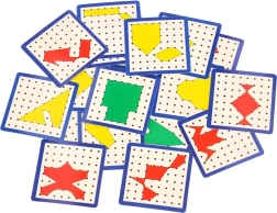 Oboustranné karty se vzory různé obtížnosti učí děti rozpoznávat tvary, barvy, symetrii i úhly. Stačí natáhnout správné gumičky a kopírovat předlohu.