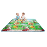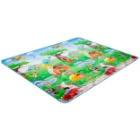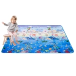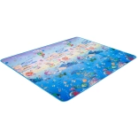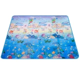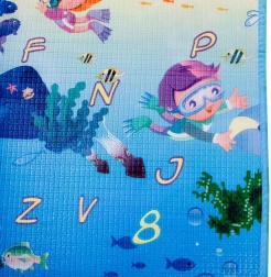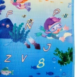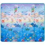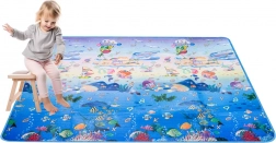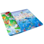 Oboustranná pěnová hrací podložka pro děti nabízí měkké a bezpečné místo na hraní i učení. Jedna strana zobrazuje mořský svět s písmeny a čísly, druhá veselou zoo. Podložka izoluje od chladu, tlumí pády a snadno se čistí – stačí setřít vlhkým hadříkem.