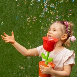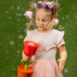 Design květiny je nejen roztomilý, ale i praktický – stabilní „květináč“ se dobře drží malým dětským ručkám. Sada obsahuje rovnou 2×40 ml kvalitního roztoku, takže můžete začít hned po rozbalení. Pro provoz jsou potřeba 3× AA baterie (nejsou součástí balení).