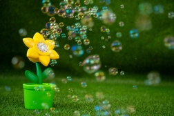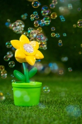 Design ve tvaru žluté květiny v zeleném květináči zaujme na první pohled a promění každou hru v veselou show plnou bublinek.