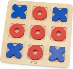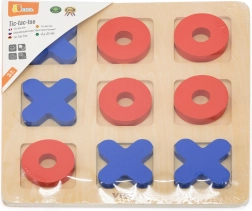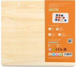 Součástí sady je dřevěná herní deska pro hru piškvorek a celkem devět barevných dřevěných prvků - čtyři modré 'X' a pět červených 'O'.