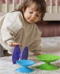 Stohování a spouštění kotoučů po spirále podporuje úchop, přesnost pohybů i koordinaci ruka–oko u dětí již od 10 měsíců.