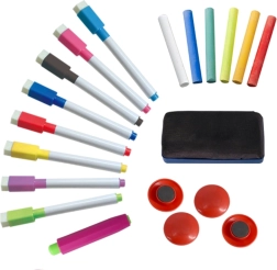 - 8 vodních fixů, 6 barevných kříd, 1 houbička/utěrka, 4 magnety
