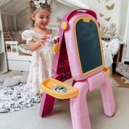 Barevná dětská tabule 2v1 kombinuje bílou magnetickou suchostíratelnou plochu a černou křídovou stranu pro nekonečné tvoření a učení. Díky stabilní konstrukci, bočním přihrádkám a bohatému setu doplňků (markery, křídy, guma, magnety) podporuje kreativitu, sou koncentraci a jemnou motoriku bez obrazovek – ideální domů, do školky i jako dárek.