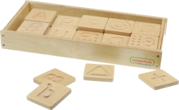 Dřevěný senzorický set Masterkidz je edukativní hračka, která pomáhá dětem rozvíjet hmatový smysl a procvičovat znalost písmen, čísel a tvarů.