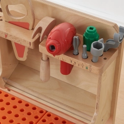 - Obsahuje stojan na nástroje pro skladování sady: ruční nástroje - hračka kladivo, pila, klíč, trojúhelník a dřevěný blok pro cvičení a elektronický šroubovák, vrtačku a sadu nástavců.