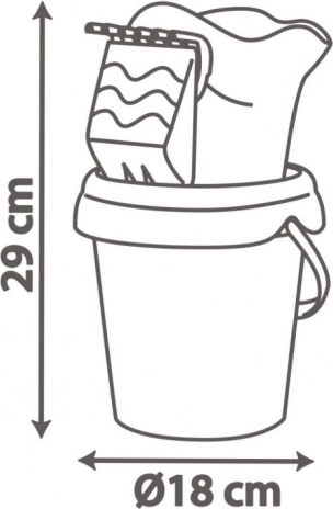Set obsahuje vše, co je potřeba ke hře: kyblíček o průměru 18 cm se sítkem, hrabičkami, lopatkou, formičkou ve tvaru srdíčka nebo kytičky a konvičku na vodu. Kompaktní rozměry a výška s příslušenstvím 29 cm usnadňují přenášení i skladování.
