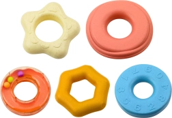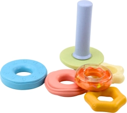 Každý kroužek má jinou texturu a jeden z nich je vybaven chrastítkem. Tím hračka poskytuje různé zvukové a smyslové podněty, které podporují rozvoj percepce a soustředění. Všechny části jsou vyrobeny z bezpečných, trvanlivých materiálů bez škodlivých látek, které jsou zcela vhodné pro nejmenší uživatele.
