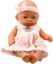 Panenka miminko v růžové sukénce s krajkou a pasující čelenkou je výjimečně rozkošná možnost pro nejmenší nadšence hraní na dům a napodobování každodenních činností dospělých. Její zavřené oči, klidný výraz tváře a pečlivě ušité, elegantní oblečení způsobují, že panenka vypadá jako spící miminko připravené na objetí, ukolébání nebo uložení ke spánku. Jemná mimika jí dodává jedinečný půvab a vyvolává přirozené pocity péče u dítěte.