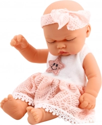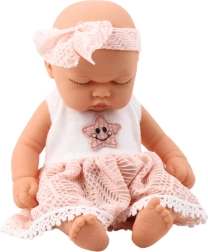 Panenka má kompaktní rozměry – cca 24 x 12 cm, což umožňuje snadné držení v dětských ručkách a zároveň se vejít do většiny kočárků a postýlek pro panenky. Stylové růžové šaty s jemným krajkovým zakončením a vyšívanou hvězdičkou ve středu spolu s ladící čelenkou tvoří kompletní outfit, který zdůrazňuje dívčí a jemný charakter hračky.
