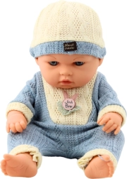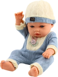 Panenka má rozměry přibližně 29 x 15 cm, což ji činí dostatečně velkou na to, aby zanechala dojem, ale zároveň lehkou a snadno ovladatelnou – ideálně se drží v malých rukou a snadno se vejde do většiny dětských kočárků či postýlek. Je oblečena do měkkého pleteného kompletu v odstínech světlého krému a pastelové modré, který je ozvláštněn nášivkou.