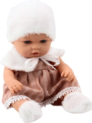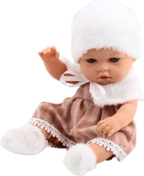 Panenka miminko je oblečena v béžových šatech s vyšívanou texturou a krajkou, doplněné bílým kožešinovým límcem a měkkou čepičkou s vázáním pod krkem. Celkový dojem doplňují kožešinové ponožky, které dodávají panence útulný zimní vzhled.